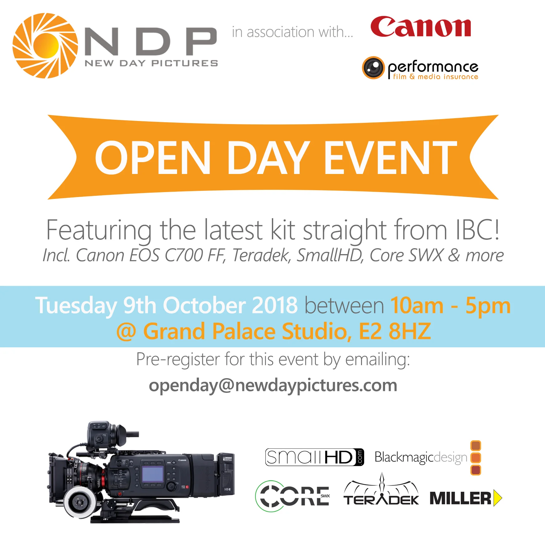 New Day Pictures together with Canon (who will be showcasing the new C700FF), Performance Media, Miller Tripods and Holdan, who will be demonstrating many brand new products (post IBC) from amongst others, Teradek, Small HD, Core Batteries, Blackmagic Design and many more...